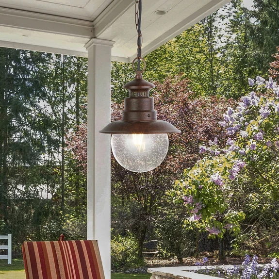 Závesné svietidlo Station pre exteriér vďaka svojmu tradičnému dizajnu dodáva každému krytému vonkajšiemu priestoru skutočnú rustikálnu atmosféru. Rustikálne kovové závesné svietidlo v štýle klasickej lucerny v hrdzavo-hnedom odtieni je vybavené čírym skleneným tienidlom, ktoré zdôrazňuje dekoratívnu žiarovku s žeravým vláknom a osvetľuje celý priestor okolo seba teplou bielou svetlom.
